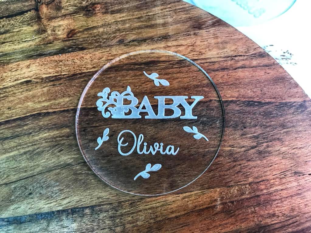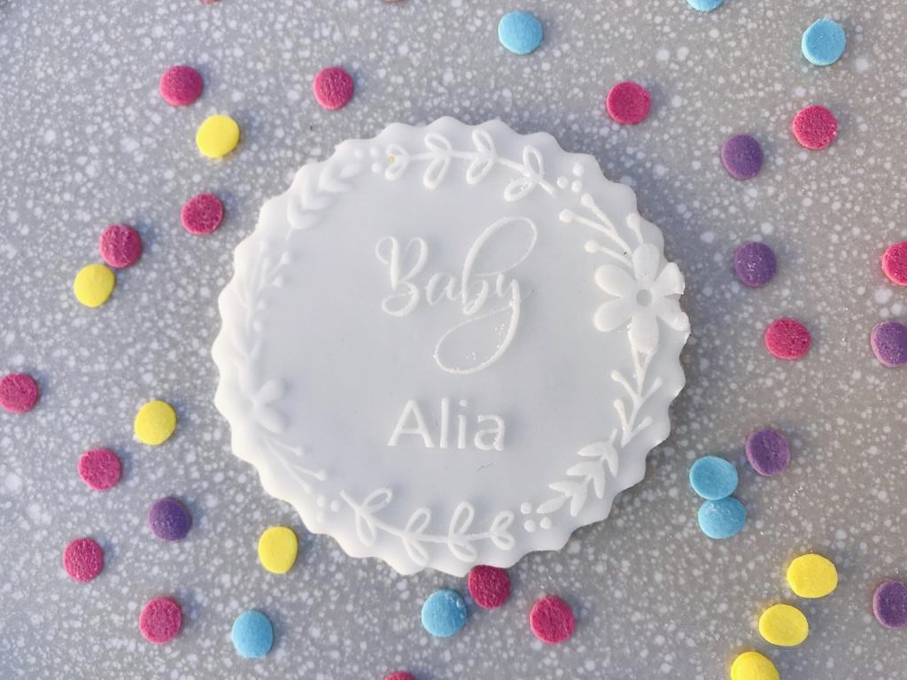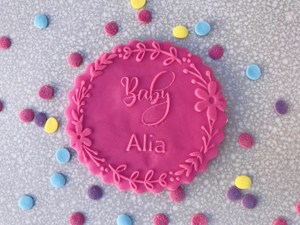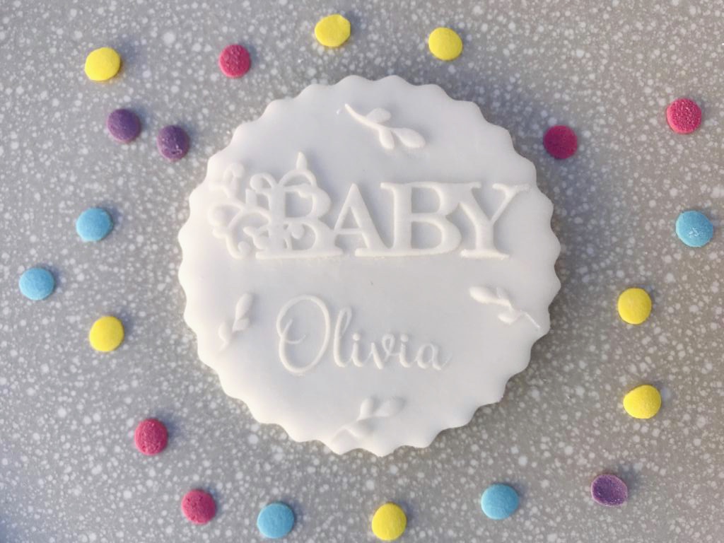 These personalised cookie fondant embosser stamps are laser engraved with the Name of the Baby
