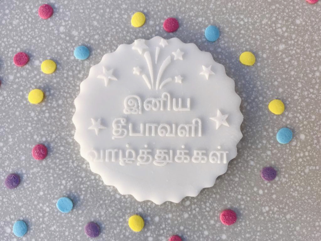 Embossed cookies fondant stamp would have the best wishes message “இனிய தீபாவளி வாழ்த்துக்கள்”, pronounced as “Iniya Deepavali Vazhtthukkal” as translated into “Happy Diwali”.